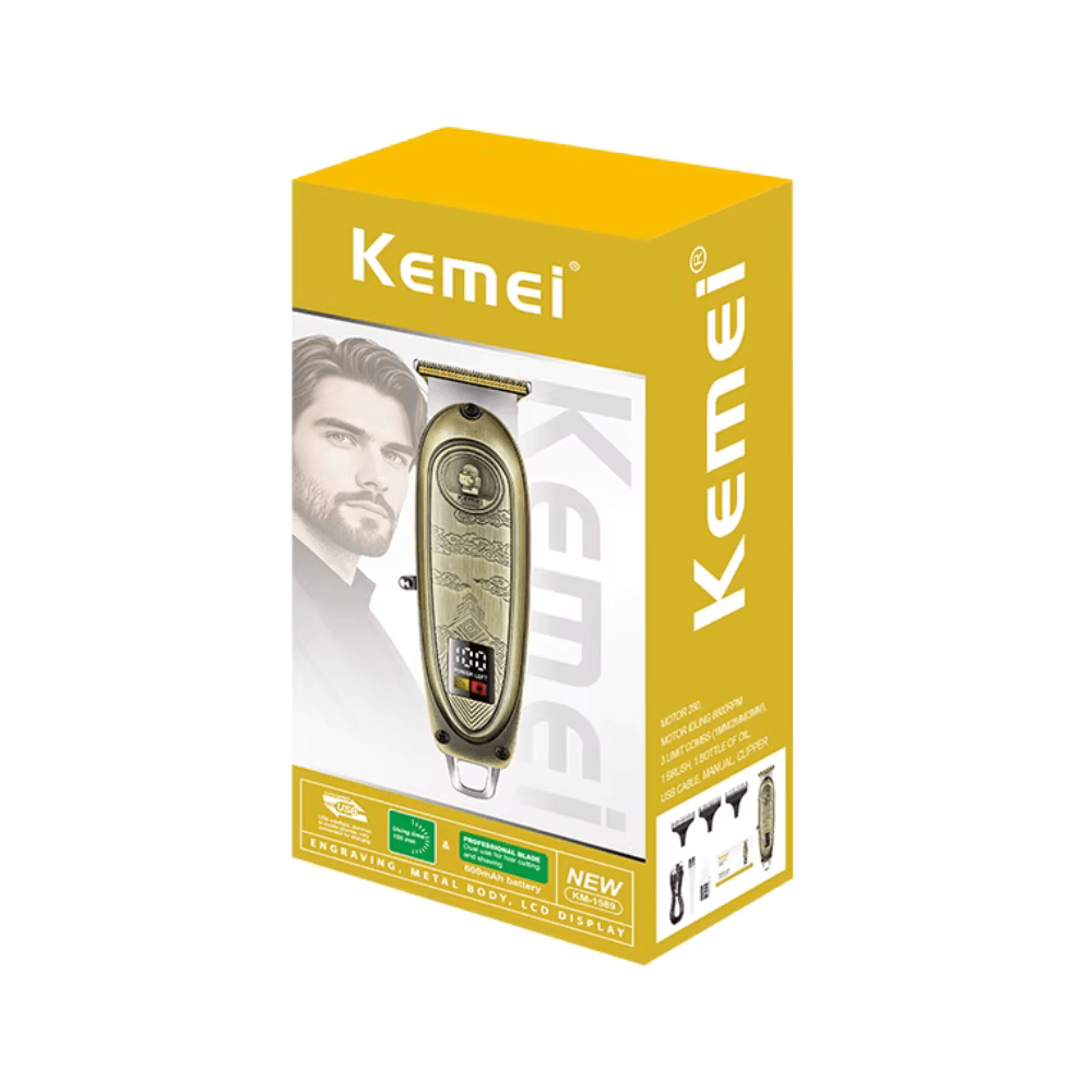 De Kemei KM-1589 is een professionele draadloze haarknipmachine ontworpen voor barbers, salongebruik รฉn thuisverzorging. Met een robuuste metalen behuizing, verstelbare snijlengtes en krachtige prestaties maakt deze tondeuse elk kapsel moeiteloos stijlvol en strak.