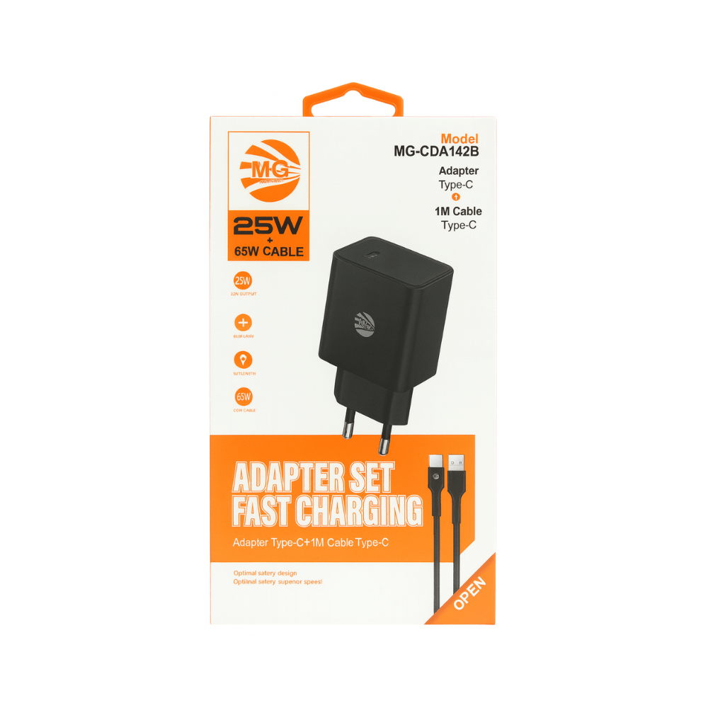 De MG-CDA142B Adapter Set biedt snelheid, betrouwbaarheid en veiligheid in รฉรฉn complete oplossing. Dankzij de combinatie van een krachtige adapter en een stevige kabel ben je verzekerd van efficiรซnt opladen โ waar je ook bent.