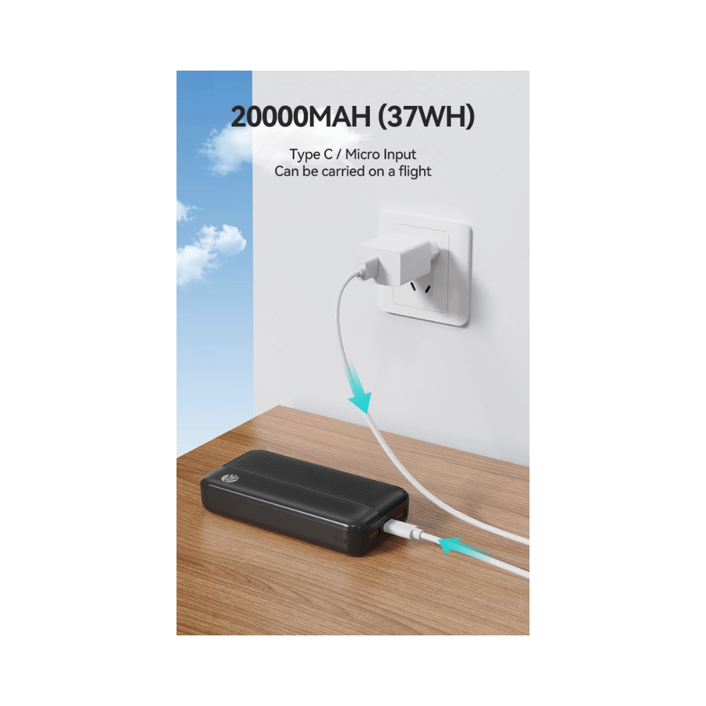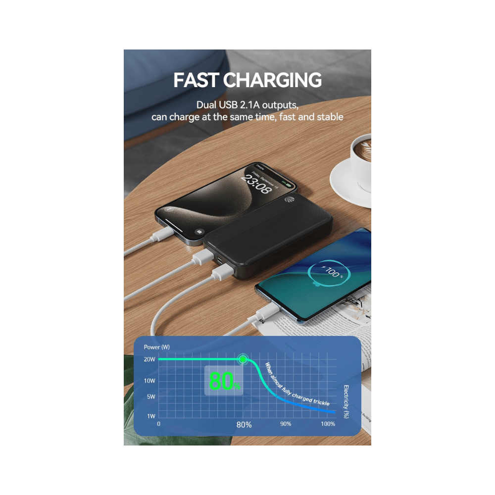 De Draagbare Powerbank van 20.000mAh biedt de ultieme oplossing voor het opladen van twee apparaten tegelijk, waar je ook bent. Met een grote capaciteit van 20.000mAh kun je jouw smartphones, tablets of andere apparaten meerdere keren opladen zonder je zorgen te maken over de batterijduur. De powerbank is ontworpen voor snel en efficiรซnt opladen, zodat je apparaten snel weer klaar zijn voor gebruik. Het slanke en stijlvolle zwarte ontwerp maakt het eenvoudig om de powerbank mee te nemen, of je nu onderweg bent, op vakantie of op het werk. Dankzij de dual USB-poorten kun je gelijktijdig twee apparaten opladen, waardoor je altijd en overal voldoende energie hebt.