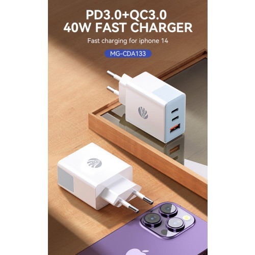 MG CDA133 – Universeel Adapter 40W – Super Fast Charging – 3 poorten – USB-C + USB – Wit