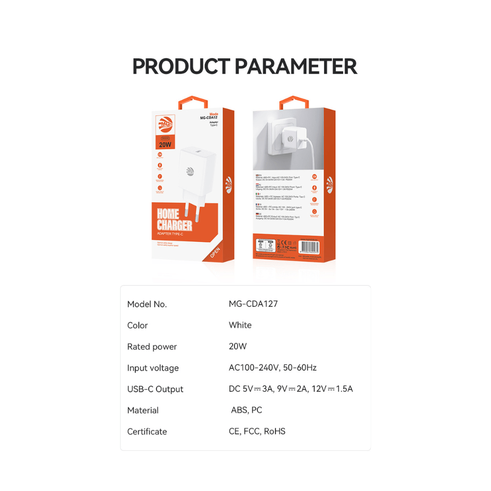 De MG-CDA127 USB-C snellader is een compacte en krachtige oplader die ideaal is voor dagelijks gebruik thuis, op kantoor of onderweg. Met een vermogen van 20W laad je je smartphone, tablet of andere USB-C apparaten snel en efficiรซnt op, zodat je nooit lang zonder batterij zit.