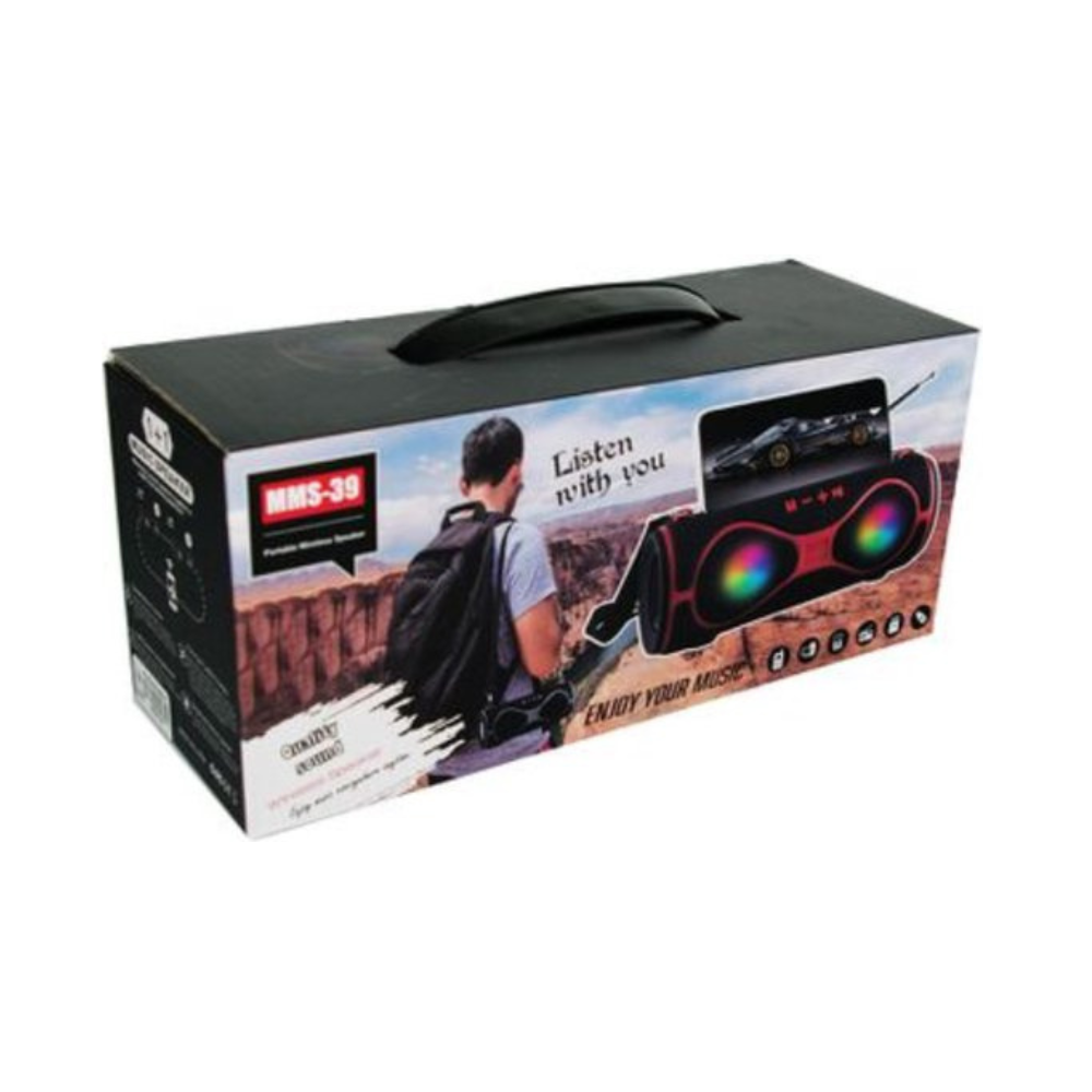 MMS-39 Wholesale Outdoor Portable Colorful Led Wireless Stereo Bluetooth Speaker Features: Music playback Bluetooth call TF FM AUX Bluetooth version: V5.0 Input voltage: DC-5V1A shell material: Aluminum alloy + ABS horn: 52 internal magnetic Battery specification capacity: Polymer 1200mA Product Size: 230*84*89mm Play time: Medium sound 3 hours Product weight: 600g Bluetooth distance: 10M Packaging material: Carton Product + color box weight: 650g Qty: 40set Carton size: 49.3*45.7*42.8CM Gross Weight: 31g